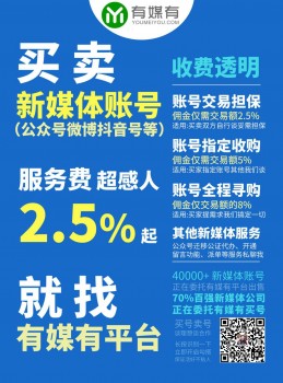 最后,我们衷心希望有媒有开启的新媒体账号交易模式2.0时代能够为您更好地服务。从今天起,在保证专业优质服务的前提下,佣金的多少完全取决于您的具体需求。2019年,有媒有全体同仁期待与您更多地合作,为您创造更高的价值!