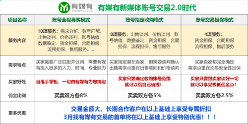 很显然,三种交易模式是从买家卖家的具体服务需求出发的,不再是“一刀切”的。因为客户的具体需求往往不同,而不同的需求,需要有媒有投入的专业优质服务也不同,相应地有媒有收取的佣金比例也明显会有差异。在保障有媒有能够顺利运营并拥有一定收益前提下,我们将尽量降低客户的成本同时提升服务质量。具体而言,有媒有“新媒体账号交易2.0时代”的三种交易模式的区别如下表格: