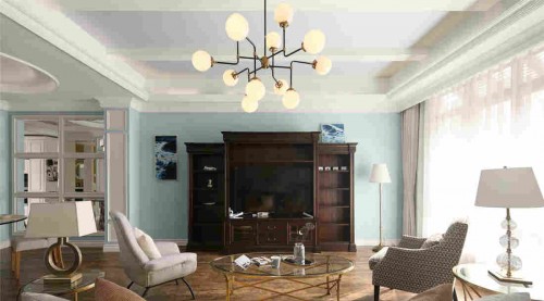 久林家具品牌浅棕色皮质沙发摆放在客厅的中间,尽显大气和高档,有效的提升了房间的视觉效果和房间装修的品质,棕色的大理石地板有着斑驳的花纹,中间的玻璃茶几下面是金色的交叉而成的金属支架。米色的单人沙发相对着摆放着。两边的台灯有着各不相同的底座,造型各异又精巧美观。吊灯由黑色的铁艺材料做成,向四周延伸,大型的明亮灯光镶嵌在尾端上。对面背景墙被粉刷着浅蓝色的鲜嫩色彩,和深棕色的木质整体书架形成鲜明的色彩对比,复古的设计显示出比较文雅的底蕴和气质。