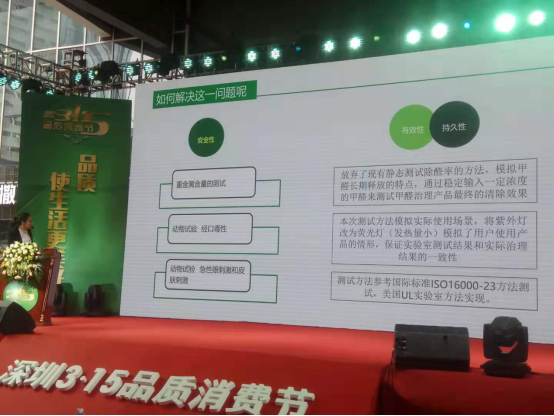 本次会议内容丰富,涵盖多种形式的签约、授牌、演讲、互动等,其中一大亮点是备受关注的欧盟级甲醛清除产品团体标准正式亮相,会上,深圳市品质消费研究院测评四部总监肜茜菲对新的《室内用甲醛清除产品》团体标准进行了介绍。