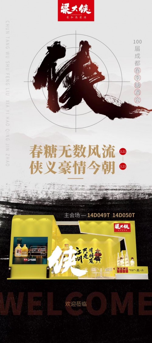 粱大侠将在3月21日至23日亮相成都中国西部国际博览城。此次粱大侠的展位占据糖酒会会场主干道C位,以活力黄为主色调的展馆必将吸引一大波经销商及消费者的注目。同时,粱大侠作为首次以侠文化入酒的品牌,在糖酒会的展馆设计上,突出江湖元素和以“侠”为主题的陈列,使得整个展馆侠气外露,却又不失时尚。