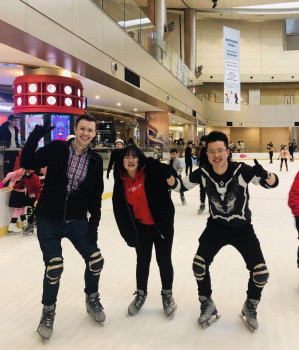 系列活动的第一项是滑冰。华尔街英语杭州大悦城学习中心教学服务经理Jonathan Gannon,延安路学习中心学习顾问Flora以及来福士广场学习中心学习顾问Lucia,带领数十名学员在预定的冰场集合。学员们都是新手,初次滑冰都小心翼翼的沿着冰场边缘行走,经过尝试练习,很快大家加快了速度,不断往更宽阔的地方滑。期间也有学员摔倒,大家还就此玩起了游戏,比比谁摔倒次数多,还特别评选了“优秀滑冰选手”。