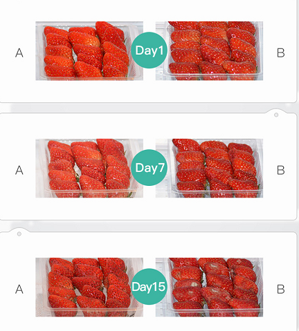 用了聚净冰箱去味宝之后,冰箱里不仅没异味,食材也不容易坏,还帮我省一大笔买食材的钱,小编还利用草莓做了一组实验,准备相同数量,新鲜程度一样的草莓,A组放了聚净冰箱去味宝,B组没放,15天之后的效果如下图: