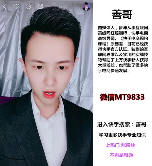 如何快速上快手热门?快手怎么上热门?我可以很负责的告诉你,用软件刷都是假的,它只是根据快速的切换IP给你制造了虚假的播放次数,刷出来的粉丝也都是死粉,说白了只是你的粉丝数量增加了,但这些都是死人,都是小号,没任何意义的,你如果想在快手里推广的话,死粉是一点用处都没有的,而且还有一个问题就是如果你用软件刷粉丝的话,很容易被快手官方封号的,得不偿失的。但是快手上热门确实是有方法技巧的, 作品的编辑 ,音乐搭配,主题,作品格式,时长等等,快手在推送你作品上热门之前会对你的作品做一个综合考察的,考核通过才会上热门,《快手电商爆粉课程》里都会有说到的:快手上热门实战方法,快手审核标准等。现在很多快手里面有几十万粉丝的红人都是用的这套教程,很管用。包括我自己也在用,我也是受益者,我现在有9万粉丝,我只是一个上班族,玩快手只是为了娱乐,当然也想上热门啊,谁不想上?尤其上热门之后的感觉特别爽,你懂的,一刷新就会看到好多双击好多评论还有粉丝关注你,我的粉丝都是根据 快手电商爆粉课程里面的方法操作来的,你也可以试试,加他威信MT9833 就能买到,也不贵。切忌:千万别作假,千万别刷粉刷播放,别因小失大。 或者快手直接搜索 善哥 关注了解更多。