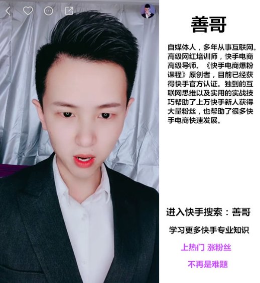 那么在这个时候每一个快手电商新人都是需要学习的,都是需要了解一个新的行业,都需要给自己的大脑充电,因为你不会,你没有经验没有接触过,而快手电商是一个新兴的事物,你必须要学习一些方式方法才能在快手里赚到钱,可以通过学习快手电商高级培训师 善哥的 《快手电商爆粉课程》来帮助自己的快手账号快速涨粉。提高账号上热门几率。快手电商爆粉课程是快手官方认证的课程,非常的实用,讲的具体内容如下: