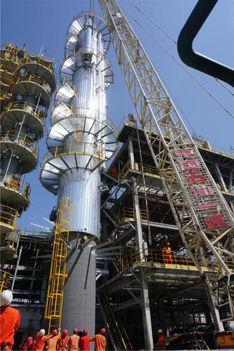 7月27日,高37.6米、重78吨的分馏塔一次吊装就位,这是独山子石化公司汽油产品升级改造项目中高度最高的一座塔器,标志着安装工作开始进入高峰。