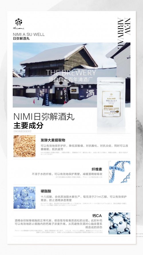 大家都知道,在各类解酒产品中,日本品牌的解酒产品是最为出名的,而日弥的Asu Well解酒丸更是其中的翘楚。与普通解酒药不同,日弥Asu Well解酒丸的成分主要以发酵大麦提取物粉末、大麦提取物,纤维素为主,食用后并不会对肝 脏、肾 脏造成代谢负担。