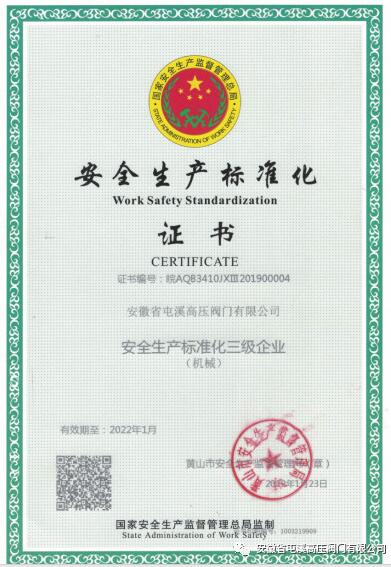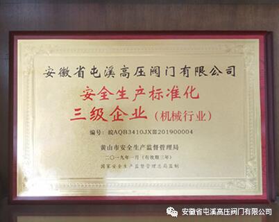 4月26日,黄山市安全生产监督管理局向安徽省屯溪高压阀门有限公司正式颁发了安全生产标准化三级企业证书及挂牌。