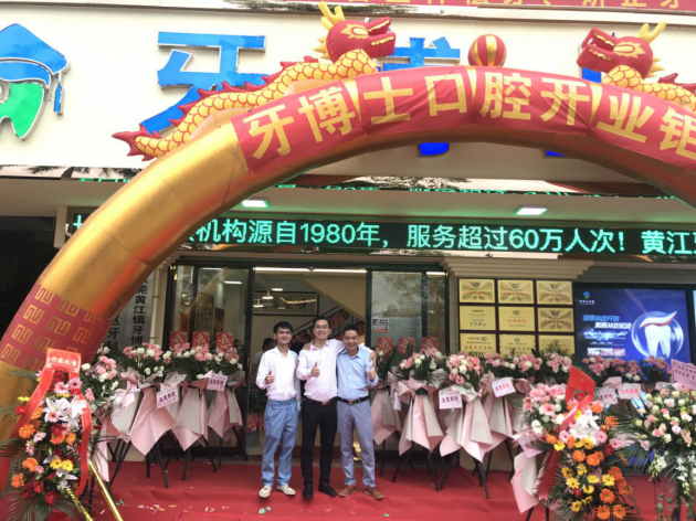 2019年5月5日,阴天,微风,25度,东莞市黄江镇黄江中学大门口正对面迎来了一场特殊喜讯:牙博士口腔连锁机构(黄江分院)在这里举行盛大的开业庆典,同时给黄江镇人民带来了两个看牙特大好消息,在黄江镇举办“黄江牙博士口腔惠民看牙健康大行动”:(一)面向黄江镇寻找100位缺牙的中老年人,对每一位缺牙的中老年黄江牙博士口腔赞助4000元种牙,40万元种牙基金送完为止;(二)面向黄江镇寻找100位牙齿不整齐、牙突、龅牙、反咬合的青少年人,对每一位牙齿不整齐的青少年黄江牙博士口腔赞助6200元的矫正费用,62万矫正基金送完为止。黄江牙博士口腔运营主任、牙科运营鬼才唐涛老师,“箍牙矫正天使”叶木林、“广州种植好牙医”种植牙专家魏楚升、“美容牙修复天使”靳亚龙、“百姓护牙天使”从琳、“活动牙佬”叶生、大岭山牙博士詹院长、东莞永嘉义齿董事长胡永国、牙博士口腔连锁(黄江分院)董事沈浩祥、贾豪辉、薛佳威等出席参加活动。