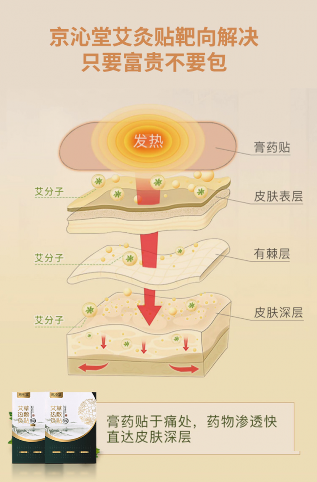 产品原材能从根本上决定产品质量,京沁堂采用了“公司+基地+车间”的三位一体化原料生产模式,万亩蕲艾生产田与其他搭配药材生产田有专业人员悉心种植。顺应天时,无农药,无化肥,自然生长,汲取天地正气,遵循原生态的生长模式,陈艾加味,才能保证药效强力渗透。热敷包的设计模式也是一大亮点,以温治病,以温驱邪,不至燥而伤阴,长效持久发热又能保证药效强力渗透。产品创新的以贴剂形式,告别传统艾灸的烟雾缭绕,并会在皮肤上留下灸痕甚至烫伤的种种状况。方便携带,操作简单,老少皆宜,可谓艾灸行业的一项重大革新。