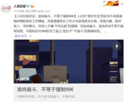 关于996,人民日报曾专门撰写评论《崇尚奋斗,不等于强制996》:人们对美好生活的诉求不再是温饱时期的拼命工作赚钱,而是需要有在工作之外获得更多价值,发现兴趣、陪伴家人、寻找意义。但现实却很扎心,这是一个不努力不拼搏就随时有可能被淘汰的时代,所以自觉或不自觉的996已经成为常态。长期的高压工作,缺乏休息,没有时间去运动锻炼......伴随而来的就是身体开始出现各种各样的小毛病,比如视力越来越差、颈椎病、腰椎间盘突出、脱发、失眠......还有最常见的“过劳肥”。