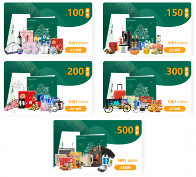 提供100、150、200、300、500 共5档标准套餐,企业可以根据预算自由选择;可为企业定制任何档位的套餐,亦支持实物团购,形式灵活,满足不同企业的多样需求。每档标准套餐提供十大品类共100多款精选商品,涵盖粽子礼盒、休闲零食、粮油干货、家居日用、实用小家电等,还有多款超值电商券,员工可自由兑换礼品。