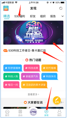 1. 登陆科界App,进入“发现”栏目,点击任何“530全国科技工作者日”活动提示均可参与。(如下图)