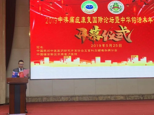 2019中澳痛症康复国际论坛开幕式正式开始,出席大会的领导和专家有国医大师李佃贵教授、澳大利亚中医药学会CEO韦国庆博士、澳大利亚中医药学会终身会长郑建华博士、澳大利亚中医药学会名誉会长曾世宗博士、河北省老科协常务副会长唐树钰、中国民间中医医药研究开发协会会长陈珞珈、中国民间中医医药研究开发协会会长助理、五官科及疑难杂症分会赵沧桑会长、五官科及疑难杂症分会副会长郑轩、原海军总医院疼痛诊疗中心主任乔晋琳教授、沙特阿拉伯金利德军事医院第一中医药中心创办人法伊兹教授、澳大利亚普赛尔董事局主席布莱顿·彼得博士、世界中医骨伤联盟主席宋永忠教授、中国民间中医医药研究开发协会钩活术专业委员会会长、钩活术创始人魏玉锁教授、中国民间中医医药研究开发协会钩活术专业委员会秘书长、钩活术总医院党支部书记赵晓明等。