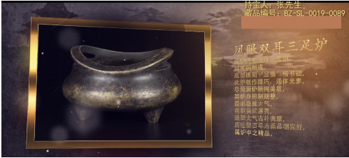 丝路卫视《丝路风云》栏目第一期于2019年6月1日20点播出。本次亮相的民间珍品一共有五件:黃賓虹的山水畫、張大千的瓔珞仕女圖、宣德年制的鳳眼雙耳三足爐、唐朝金庫的黃金蛙以及雙耳喜字青花纏枝蓮紋賞瓶。