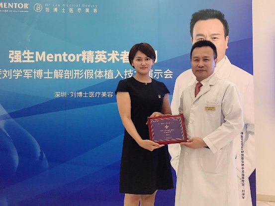 强生MENTOR深圳区负责人林沁岚女士授予刘学军博士“强生MENTOR解剖型假体手术指导专家”荣誉