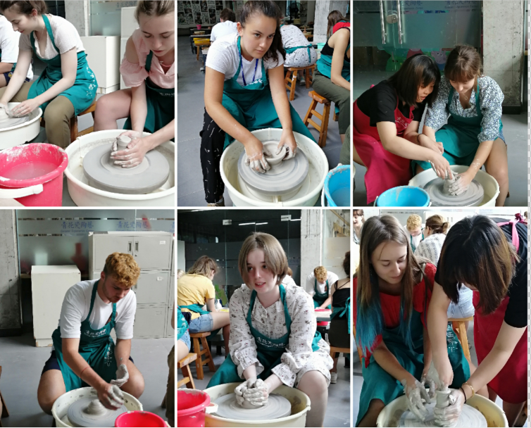 同样,陶艺老师对第一次接触拉坯机的外国学生们悉心指导,亲自示范,虽然这群学生是第一次学习拉坯,但是他们个个认真劲儿十足,按照老师的指导,做出了非常不错的碗、盘、花瓶等圆形的器物。陶艺老师也感叹:“你们真是我带过最棒的一届外国学生!”大家在愉悦的气氛中结束的半天的课程。