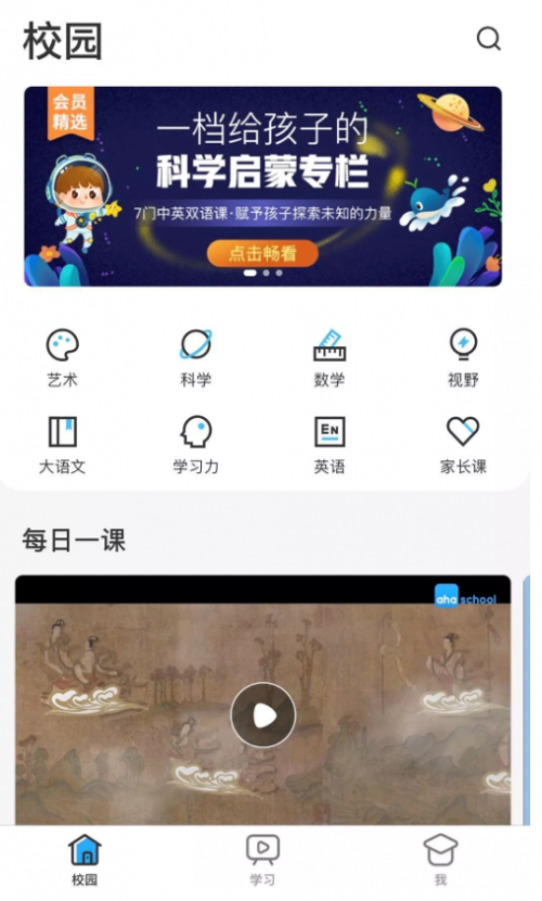 2019年6月1日,ahaschool正式推出无限畅学计划,包括了艺术、科学、国学、人文、视野等200门+视频精品课,并提供严选服务和会员专享优惠等教育服务,深受孩子和家长的喜欢。
