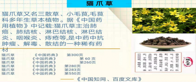 1994 年6 月世界卫生组织在瑞士日内瓦召开了有关猫爪草的第一次国际会议,在会上猫爪草正式被官方接受为药用植物,被誉为给现代人一个黄金般的贡献。大量的对这一威力极大的草本植物所作的研究,使得许多科学家放弃了仅仅使用化学药物治疗疾病的思路。