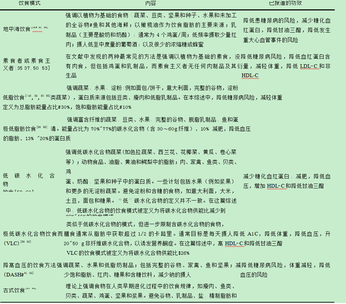 (1) 多种饮食模式(不同食物或食物组合)可用于糖尿病的治疗。!)在不能确定对特定个人的最佳饮食模式之前,专业人员应将重点放在这些模式中常见的关键因素上:强调不含淀粉的蔬菜;减少添加的糖和精制谷物;尽量选择完整的食物而不是精加工的食物。!)减少糖尿病患者的总碳水化合物摄人量有利于改善血糖,并且可以应用于满足个人需求和偏好的各种饮食模式中。!)对于那些未达到降糖目标的T2DM或者优先考虑减少降糖药物的患者,减少碳水化合物的摄人和低碳水化合物的摄人是一种可行的方法。