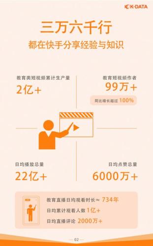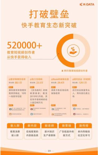 到今天为止,用户消费好内容获得知识的同时,高达52万的教育短视频创作者已经通过快手获得了收入,并推动短视频与教育行业深度融合,为教育拓展了“新人群”,创作出“新内容”,孵化出“新老师”,也在推动着教育营销方式、社交化学习的革新。