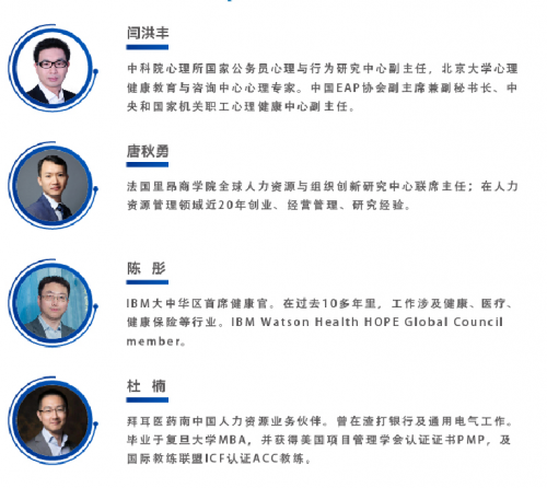 1、 20092019中国企业员工心理健康白皮书发布;2、?权威专家、行业精英、企业HR高管从专业的角度解读企业大健康发展趋势;3、 500强企业从企业实践角度分享如何为员工打造健康管理体系并提升业务价值;