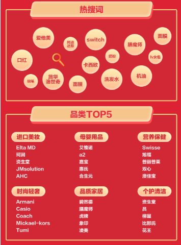 本次“海囤全球日”,消费者最为关注的产品是什么?京东大数据显示,爱他美、口红、switch、施华洛世奇、卡西欧、膳魔师、洗发水、面膜成为热搜关键词,来自日本、美国、韩国三个国家的产品分列成交额前三甲。热销品类TOP5排名中,进口美妆一骑绝尘,母婴用品分毫不逊,营养保健步步紧逼。
