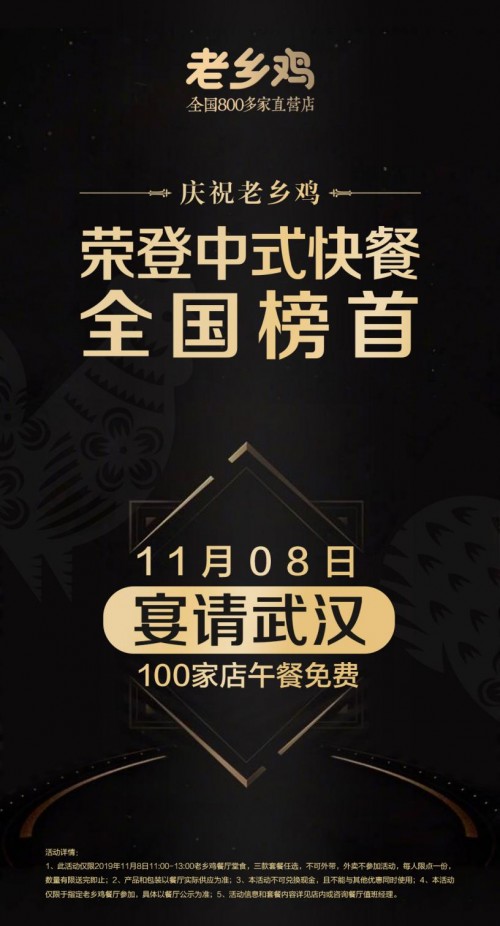 2019年11月5日,“老乡鸡荣登中式快餐全国第一暨武汉市场战略联盟发布会”在武汉知音号上隆重召开,发布会现场碧桂园、绿地、万科、东湖高新、居然之家、欧亚达、亿事达、桥七、三合、悦联商业等10多家知名房地产签订战略合作联盟。2019年10月,在中国烹饪协会发布“中国快餐企业70强”榜单上,老乡鸡与麦当劳、肯德基、汉堡王等国际知名品牌同时进入四强,并位列于中式快餐排名榜首,真正成为全国中式快餐第一品牌,也是中国快餐品牌发展的里程碑。