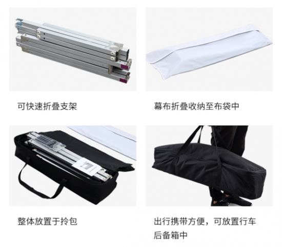 云龙佳幕布有多种尺寸和款式可供消费者选择,这款100英寸快速折叠幕布是全铝合金自带折叠结构,观看高度可上下调节,折叠收纳较为方便,可放置后备厢,随需随用,适用于家庭户外出行使用,让您享受不一样的户外观影感受。