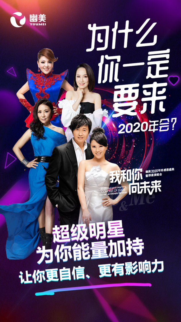 万人的盛大规模,震撼的舞台设计,重磅的明星阵容,“我和你?向未来”幽美2020年终感恩盛典——暨群星演唱会期待你的光临!