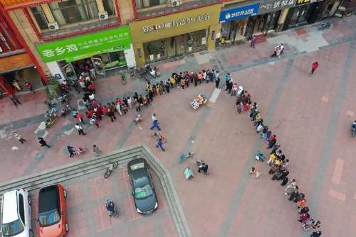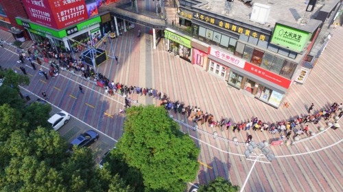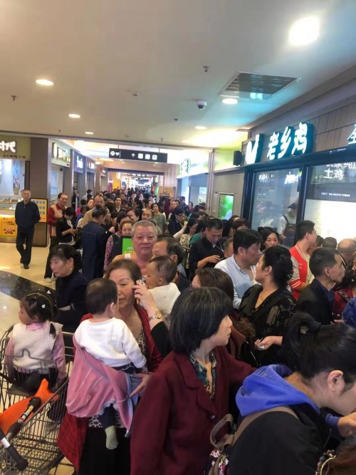 上午9点左右,部分店面门口已经出现了排队客流。更有甚者,表示早上8点不到就已经排队。到上午10:30左右,在汉口火车站,循礼门、中南国际城、京汉商业街等门店,早已人山人海;在循礼门店,队伍绕了好几圈,工作人员不得不组成人墙维持秩序。