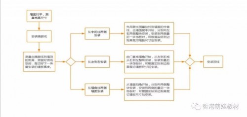 由墙面居中开始,分别向左右两 侧整块安装,安装到两侧最后一块饰板时,可根据实际到边距离修正饰板 尺寸后安装:先用激光测量仪在墙面找出中垂 线,安装第一块饰板后在饰板的两侧 插入中缝线,在中缝线上打钉固定, 参照第一种饰板的安装方法,依次安 装两侧的饰板。