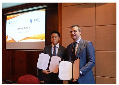 联康生物科技集团有限公司执行董事梁国龙先生(左)与卢凯贸易(上海)有限公司行政总裁 Robert Braithwaite先生(右)签订战略合作伙伴关系。