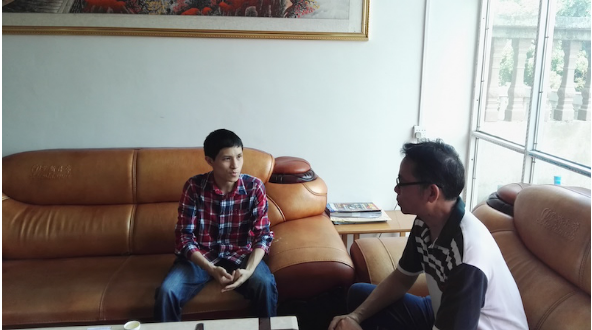 广西建材电商平台创建人谢少东(图左)在接受记者采访