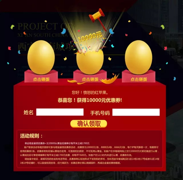 砸金蛋中奖后,请填写您的姓名和电话号码,优惠券将以短信形式下发到您的手机,您在西安华南城购买E1区14街1栋17号或者E1区14街1栋19号旺铺时,可以直接抵现使用,应付尾款为:优惠后单价乘以商铺面积,再减去金蛋优惠券额度。
