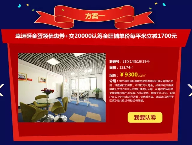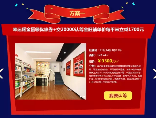 方案一:幸运砸金蛋领优惠券+交20000认筹金旺铺单价每平米立减1700元