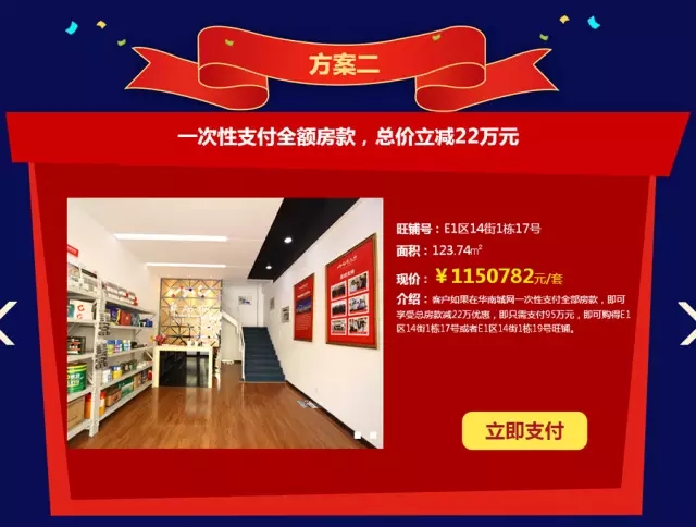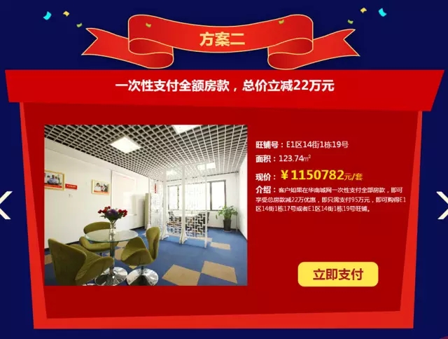 客户如果在华南城网一次性支付全部房款,即可享受总房款减22万元优惠,即只需支付95万元,即可购得E1区14街1栋17号或E1区14街1栋19号的40年产权旺铺。