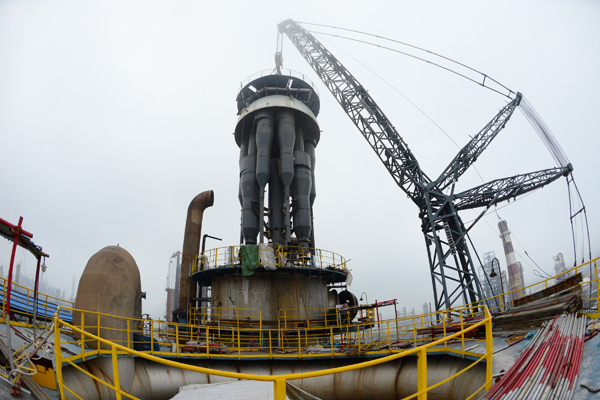 ? ? 炼化工程集团宁波工程公司承担的镇海炼化300万吨/年催化装置检修改造实现重大里程碑节点。5月27日下午,经过近两小时的吊装作业,吊装总重量145吨、高约15米的装置反再系统更新沉降器封头连同粗旋、单旋等构件,被750吨吊车“拎”上60米高空,并在随后装入沉降器,成功“扣盖”复位完毕。