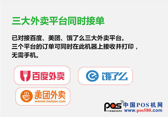 生意火TPS390外卖接单机已经成功对接了百度外卖、美团网、饿了么三大外卖平台,三个平台的订单可同时在此机器上接收并打印,不需要切换,不仅节省了店铺柜台空间,也为店主解放了手机,并能实现快速打印外卖单。