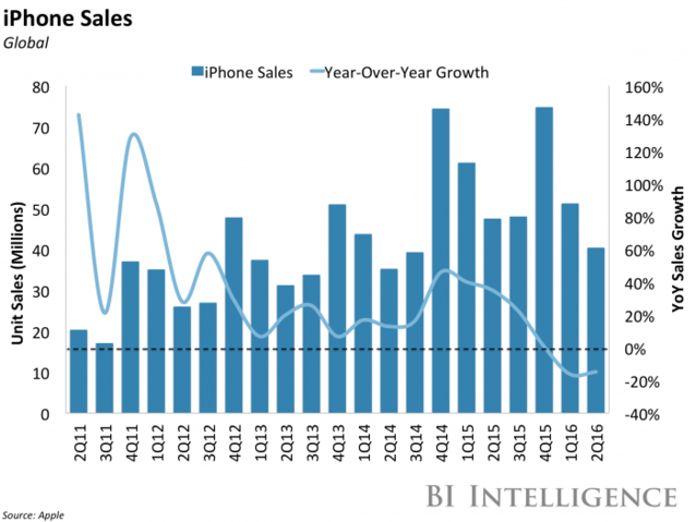 还记得2001年发生了什么吗?2001年10月,苹果发布了iPod音乐播放器,这一个创新的硬件以及2007年发布的iPhone带来了高速增长的15个年头,目前苹果公司的营收已经是2001年的40倍。苹果在2016财年的收入达到2156亿美元,这超过希腊的GDP,同比2015财年下降180亿美元,约8%。