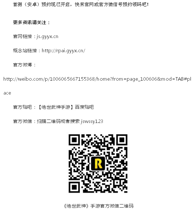 想要成为全球首款R式卡牌《绝世武神》手游的第一批用户,想要获得首测资格,请到《绝世武神》手游官网或官方微信号,使用手机号码便可进行测试预约。预约完成后,官方将以短信的形式通知“被选中”的玩家。诚邀您前来参加《绝世武神》安卓的预约测试!