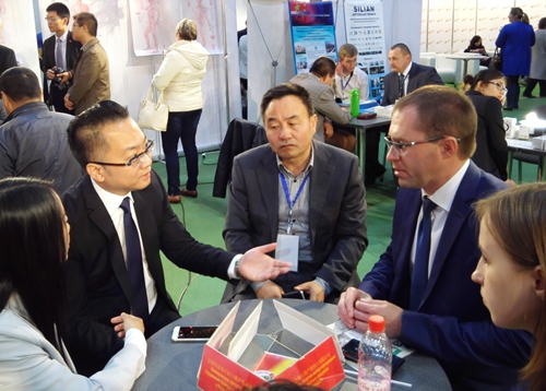 东呈酒店集团副总裁赵俊涛(左)与格罗德诺副市长安德烈(右)在展览会上会谈