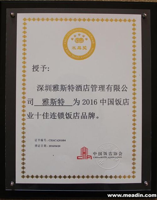 中国饭店业“水晶奖”颁奖盛典是本次中国饭店文化节的重头戏,也是中国酒店业最具权威的唯一大奖,堪称酒店餐饮业奥斯卡。在颁奖典礼上,雅斯特酒店凭借其良好的发展前景、独特的经营模式、领先的品牌战略斩获“2016年度最佳连锁饭店品牌”奖项。与如家、维也纳、速8、亚朵酒店、中南怡海、隐居、锦江都城等知名酒店品牌一同获此殊荣。