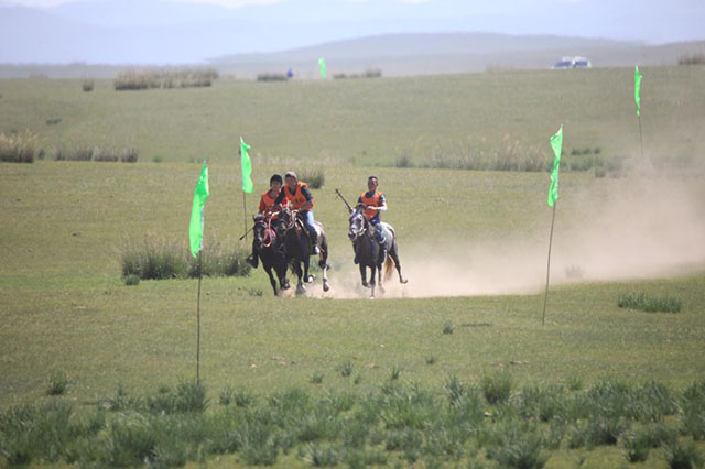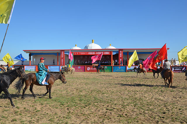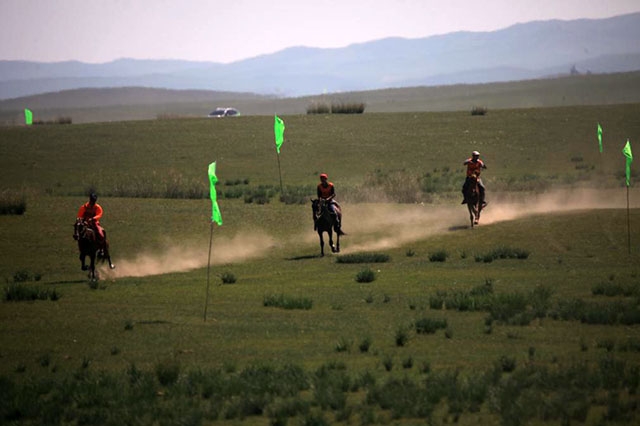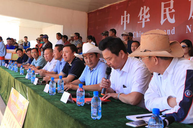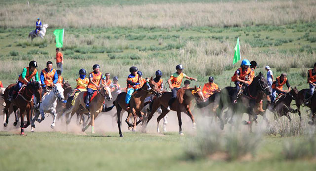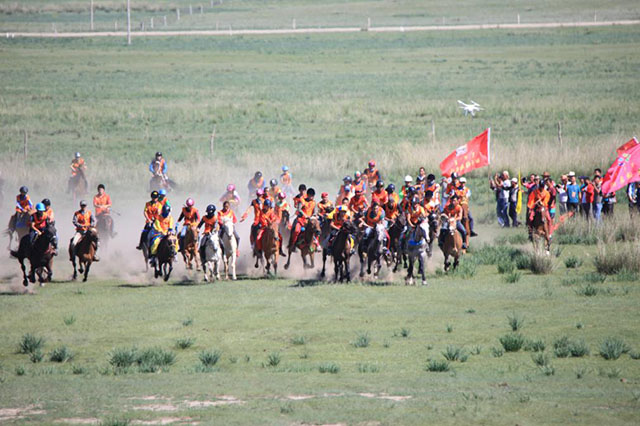 上午9时,来自北京、山东、山西、江苏等地和内蒙古自治区本地的90对人马组合齐聚赛道起点,等待开赛发令枪响起那一刻。本次比赛赛程为26公里,赛事组委会规定,所有的参赛骑手年龄都必须在15周岁以上,这是为了保护骑手的安全和维护比赛公平而设置的规定。在中国广袤的草原上,很多孩子都是在马背上长大的。可能在他们还不太会走路的时候,就已经可以骑马了。因此,在很多传统的民族赛马中,参赛的小骑手非常之多,但也不时会有小骑手因控马能力差而意外落马受伤的。随着开赛令枪一响,起点处绿色的马栅一倒,群马奔腾而出。霎时间,草原上风雷浩荡,黄烟滚滚。爆发力极强的英纯血、沙漠之王阿拉伯马等世界名马,也都前来参加比赛。主场作战的蒙古马,虽然身材相对矮小,但它对草原的环境、气候非常熟悉,占尽了主场之利。当它们同场竞技的时候,赛道上便瞬间便变得十分精彩,也令比赛结果变得颇具悬念。