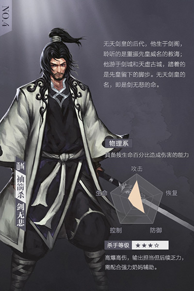 澄明剑痴剑无悲,剑阁中人,无天剑皇的后代。作为无天剑皇的后人,剑无悲生来就是剑客之命,高爆发力是剑客的不二特性,以命搏击换取敌方伤亡,稳、准、狠如袖中剑,出其不意一击必杀。