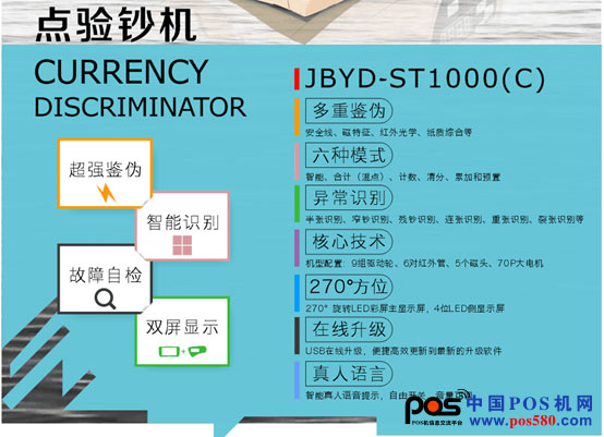 据温州商通相关负责人向中国POS机网介绍,过去他们一直在做国外点钞机市场销售,鉴于国内点钞机需求膨大,他们已计划于今年开始在国内销售其最新研发点钞机产品。其中JBYDST1000是温州商通众多先进智能化点钞机产品中的一款典型代表,机型小巧,配有银金色外观,凸显高贵大方,且操作方便,自动化程度高,功耗小。JBYDST1000机型配置齐全,含多种核心技术,如9组驱动轮、6对红外管、5个磁头、70P大电机等应有尽有。具安全线、磁特征、红外光线、纸质综合等多重鉴伪功能,可高效识别伪劣假币。同时兼具智能化的异常识别特性,对半张钞、窄钞、残钞、连张钞、重张钞、裂张钞等异常钞票识别能力强。模式齐全,含智能、合计(混点)、计数、清分、累加和预置等六种模式。LED彩屏主显示屏、4位LED侧显示屏均全方位视角(可旋转270度);此外,其USB可在线升级,便捷高效更新到最新升级软件,应用十分方便,且含智能真人语音提示,自由开关、音量可调,还可故障自检。