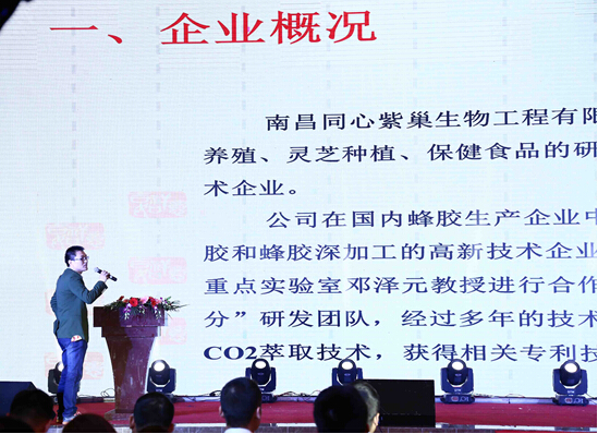 南昌同心紫巢质量与研发主管李广焱在善缘堂蜂胶新品发布会上讲话