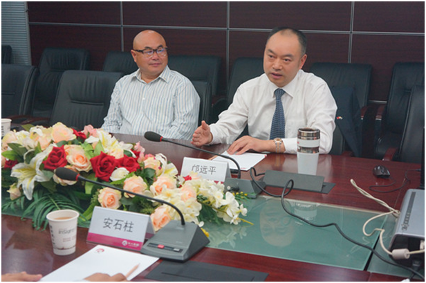 邝远平通过PPT形式,图文并茂地向安石柱介绍了华人集团的情况。华人集团是中国成长型企业金融服务提供商,有着完善的服务产业链,有丰富的企业金融服务经验,有突出的服务企业业绩,在促进本集团快速发展的同时,还带动了一批批企业的发展。集团有明确的经营理念,有前瞻性的经营策略,有健全的组织架构,在湖北侨企中唯一一家健全党委、工会、团委组织的企业。