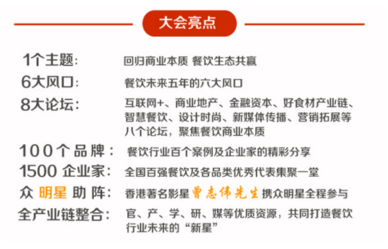 大会将以“回归、共赢”为主题,围绕这些疑问展开深入探讨。届时,局气韩桐、西贝贾国龙、金百万邓超、麻辣诱惑韩东等餐饮大咖将结合自己的实战经验与大家分享餐饮经营心得。更有明星大腕曾志伟携100多位餐饮星咖精彩亮相,共同为与会者打造餐饮界规模巨大的知识盛宴。