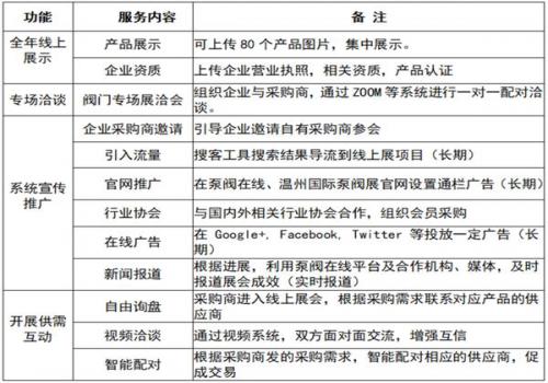 2.全年线上展示:在“泵阀在线”平台(www.wpvb2b.com)开辟“龙湾阀门专区”,组织阀门行业企业入驻。每家入驻企业可上传不超过80个产品图片,线上展示时间至2020年底。